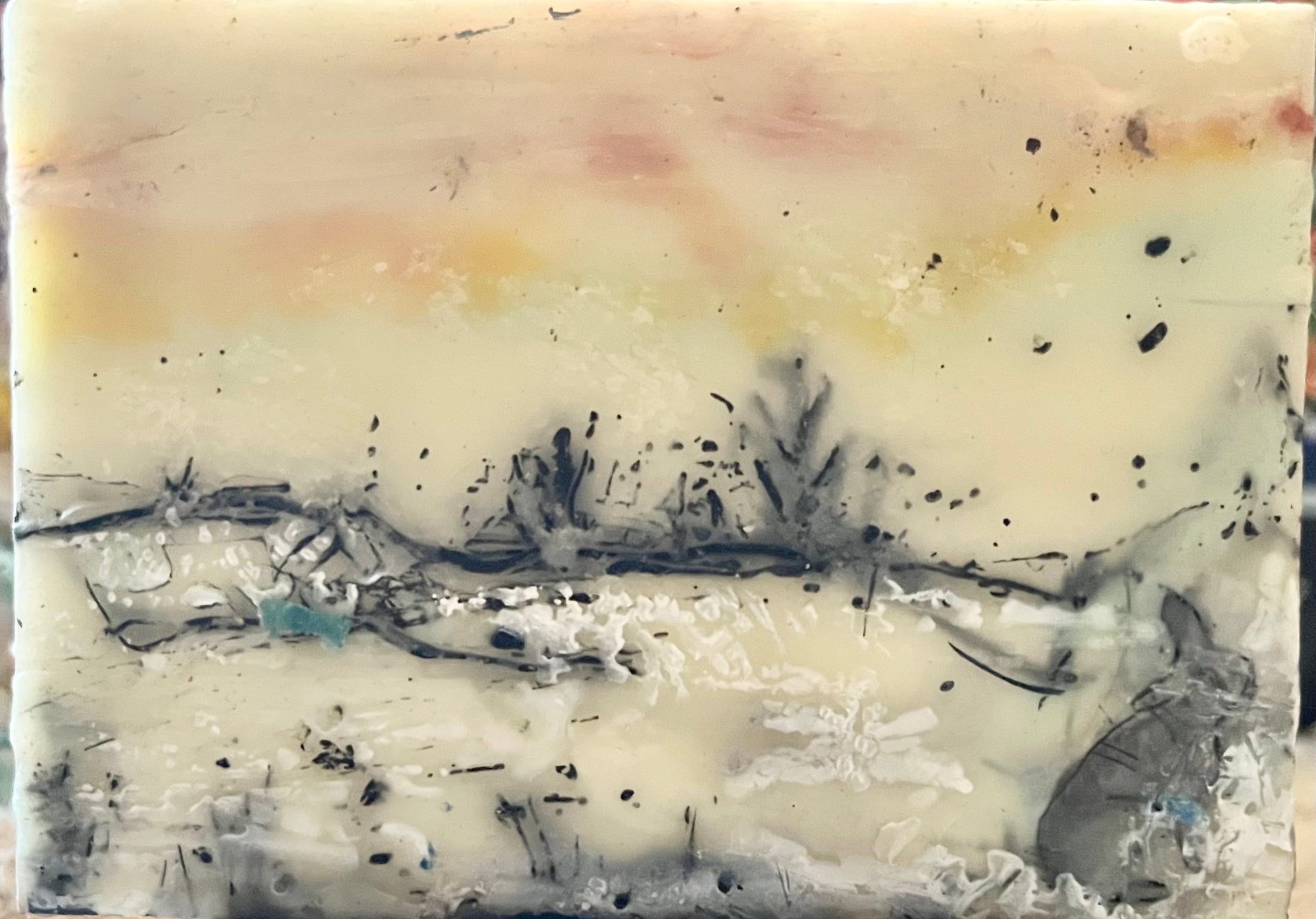 Small Artist Trading Card (ATC) size work, original handmade encaustic artwork created with encaustic paint and mixed media on wood, created by Grelaine (Grelaine_Art on Instagram)