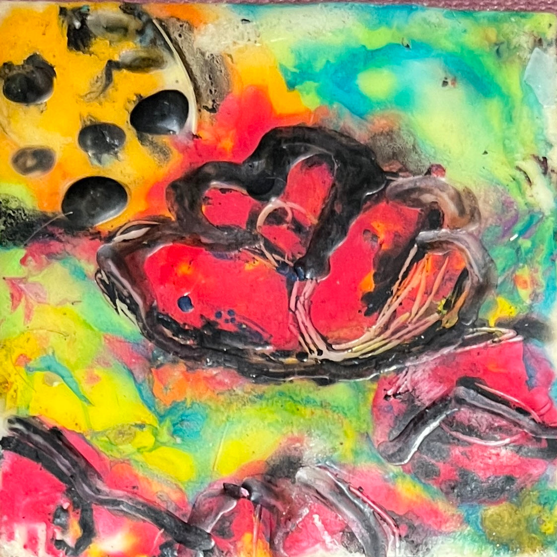Smallest of the "small works", original handmade encaustic artwork created with encaustic paint and mixed media on wood, with a magnet. created by Grelaine (Grelaine_Art on Instagram)