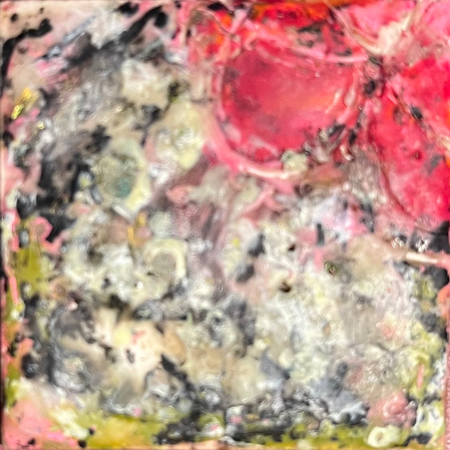 Smallest of the "small works", original handmade encaustic artwork created with encaustic paint and mixed media on wood, with a magnet. created by Grelaine (Grelaine_Art on Instagram)
