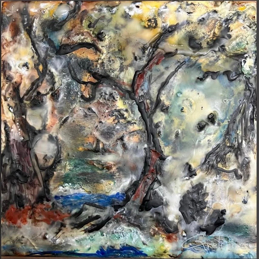 Larger of the "small works", original handmade encaustic artwork created with encaustic paint and mixed media on wood, with a wood stand created by Grelaine (Grelaine_Art on Instagram)