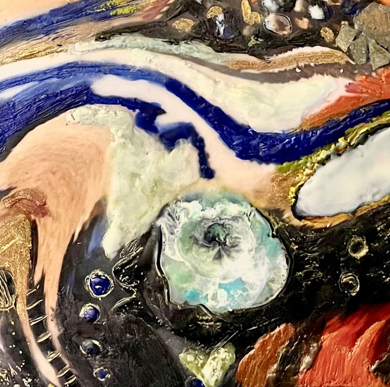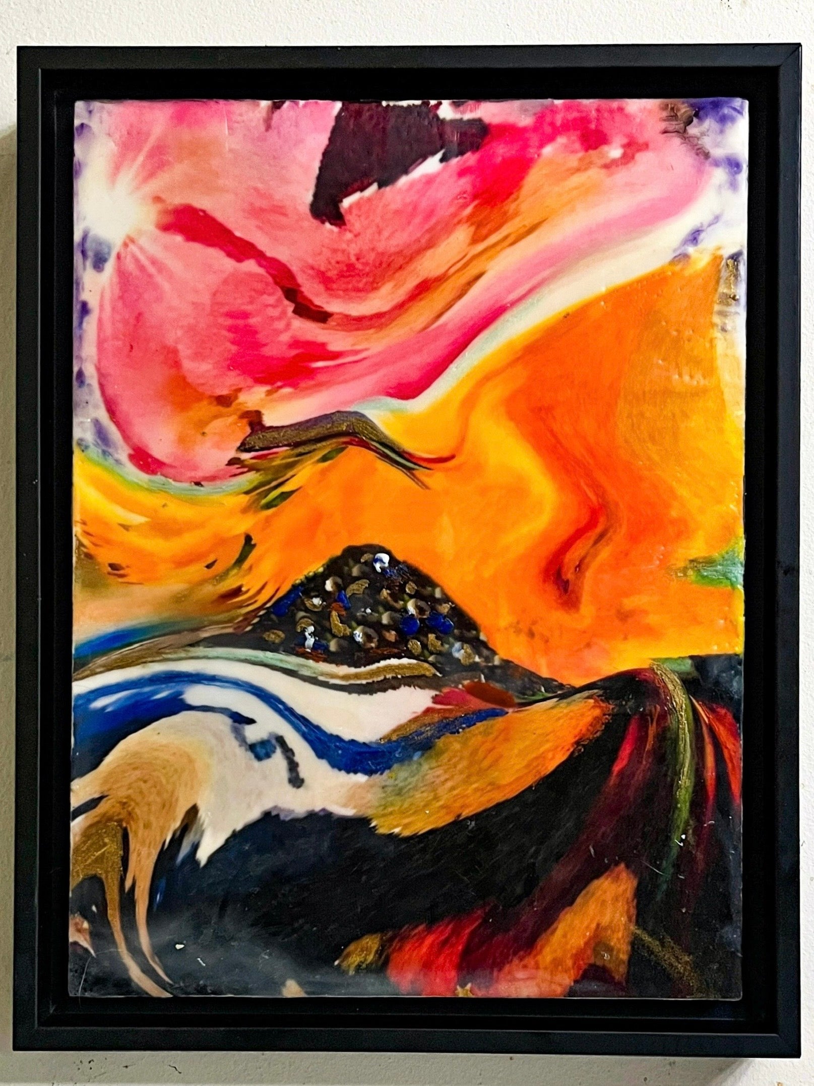 9 x 12 Encaustic Fine Art painting impressionistic abstract of a pile of things (valuables, worries, past trauma, material items- it’s up to interpretation) and a path with multiple endings for the viewer to take, leaving the pile behind. Second photo is a detail close-up.